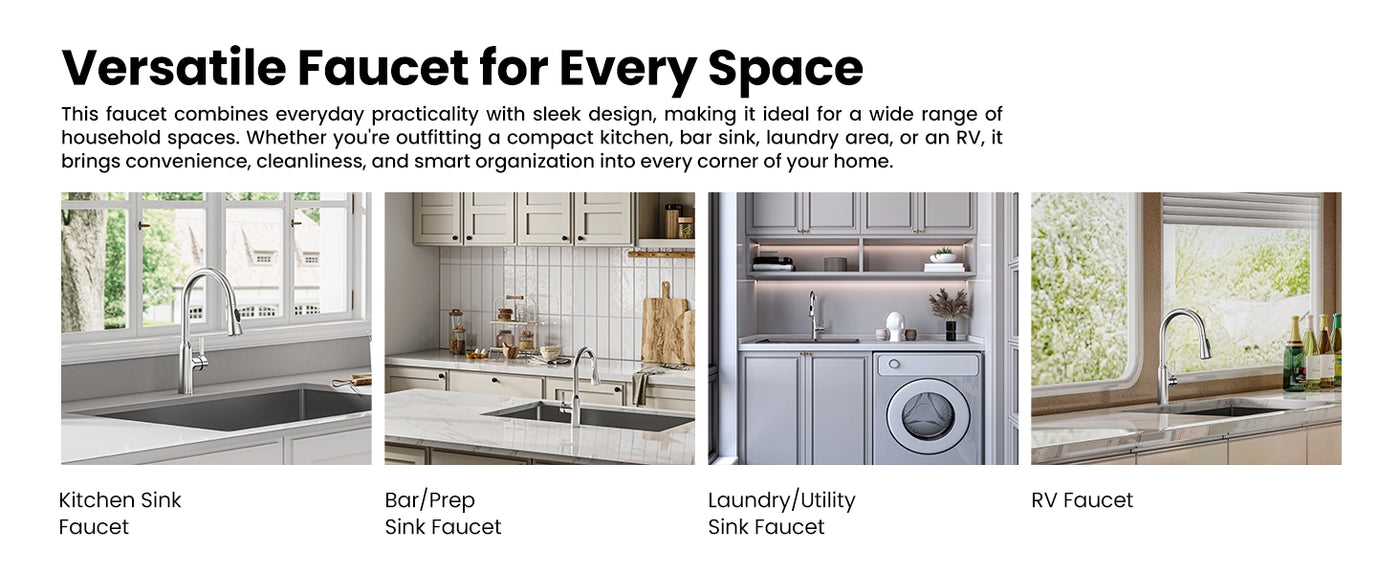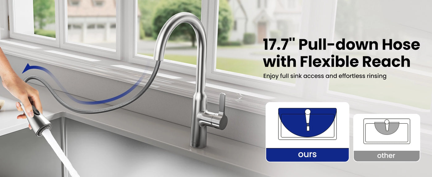 Easily switch between stream, spray, and pause functions for versatile cleaning. The 17.7″ retractable hose and 360° swivel spout give you full sink coverage, making this faucet ideal for kitchens, RVs, campers, laundry rooms, and farmhouse sinks.