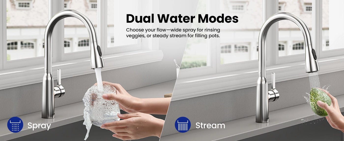 This pull-down kitchen faucet delivers a powerful 2.5 GPM flow rate that meets U.S. DOE standards. NSF/ANSI 61 & 372 certified, it ensures safe, lead-free water for your kitchen sink while maintaining excellent efficiency.
