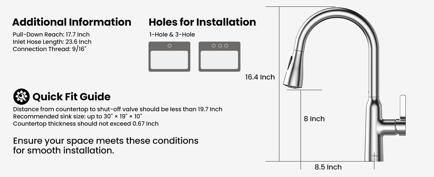 Designed for quick setup, this kitchen sink faucet includes 3/8″ female compression hoses, a quick-lock nut, and all installation accessories. Fits both 1-hole and 3-hole sinks—no plumber required. Simply tighten and secure.